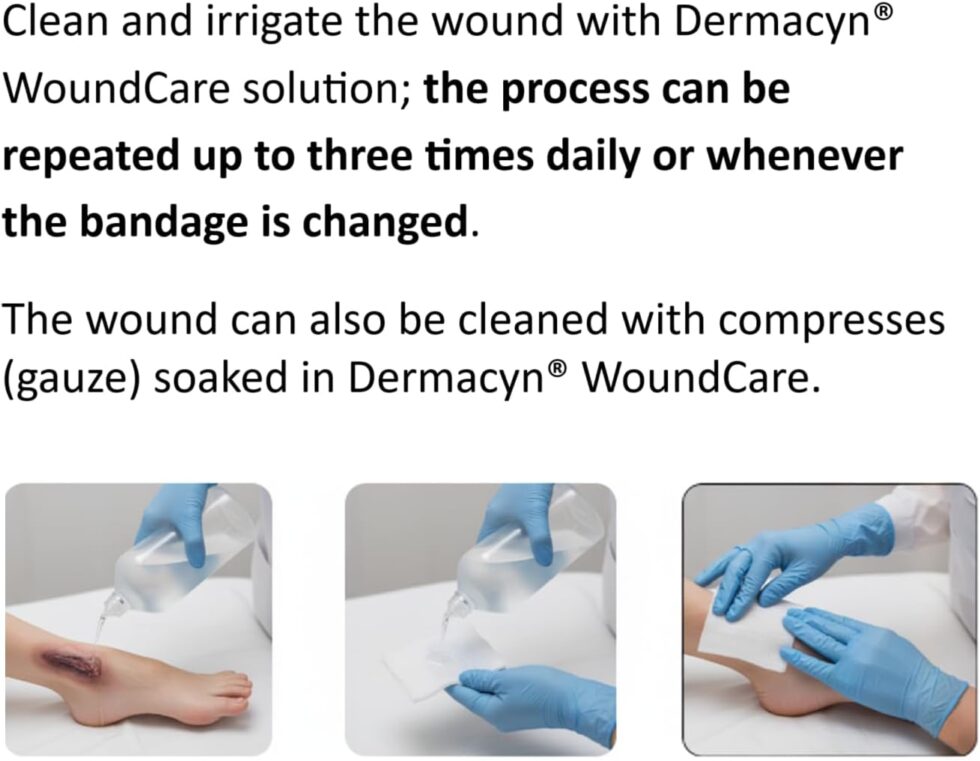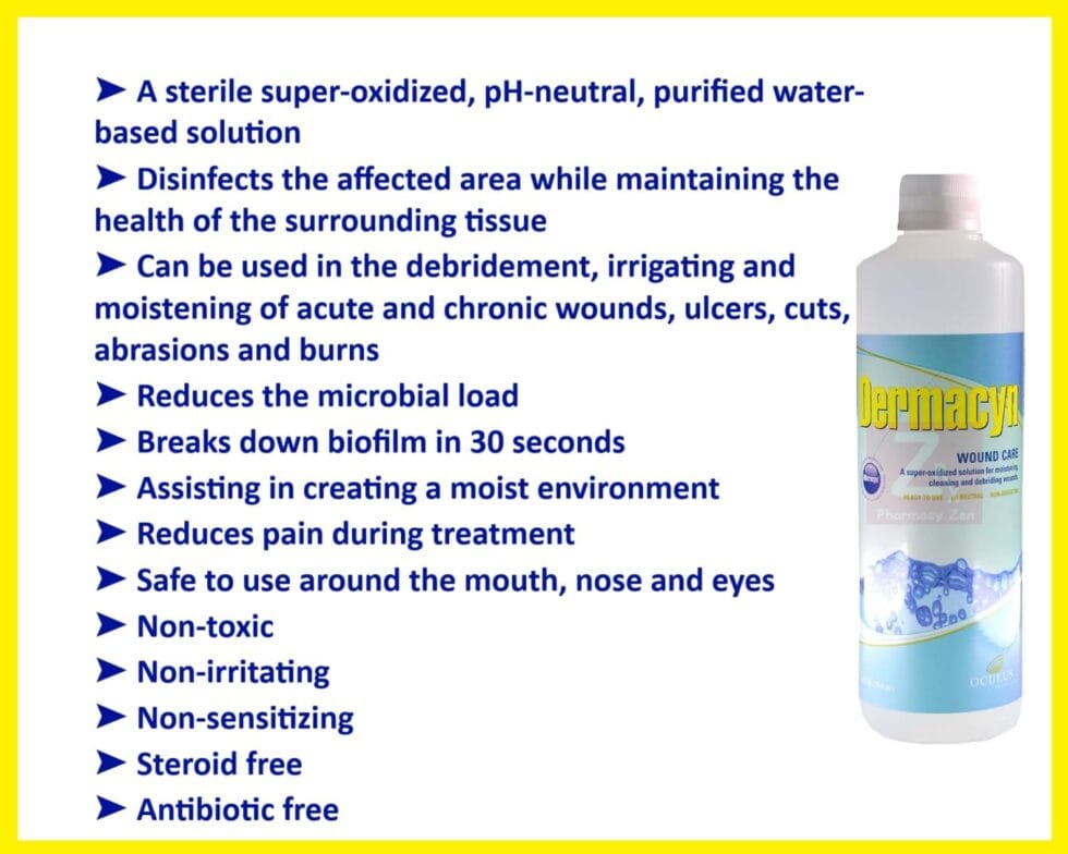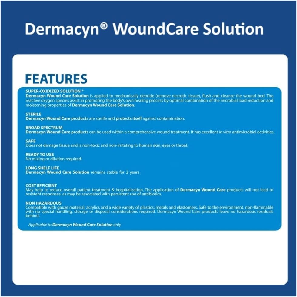Dermacyn® is intended for moistening absorbent wound dressings and for debriding and cleaning acute and chronic dermal lesions such as stage I-IV pressure ulcers, Stasis ulcers, diabetic ulcers, post-surgical wounds, First and second-degree burns, abrasions and minor irritation of the skin.