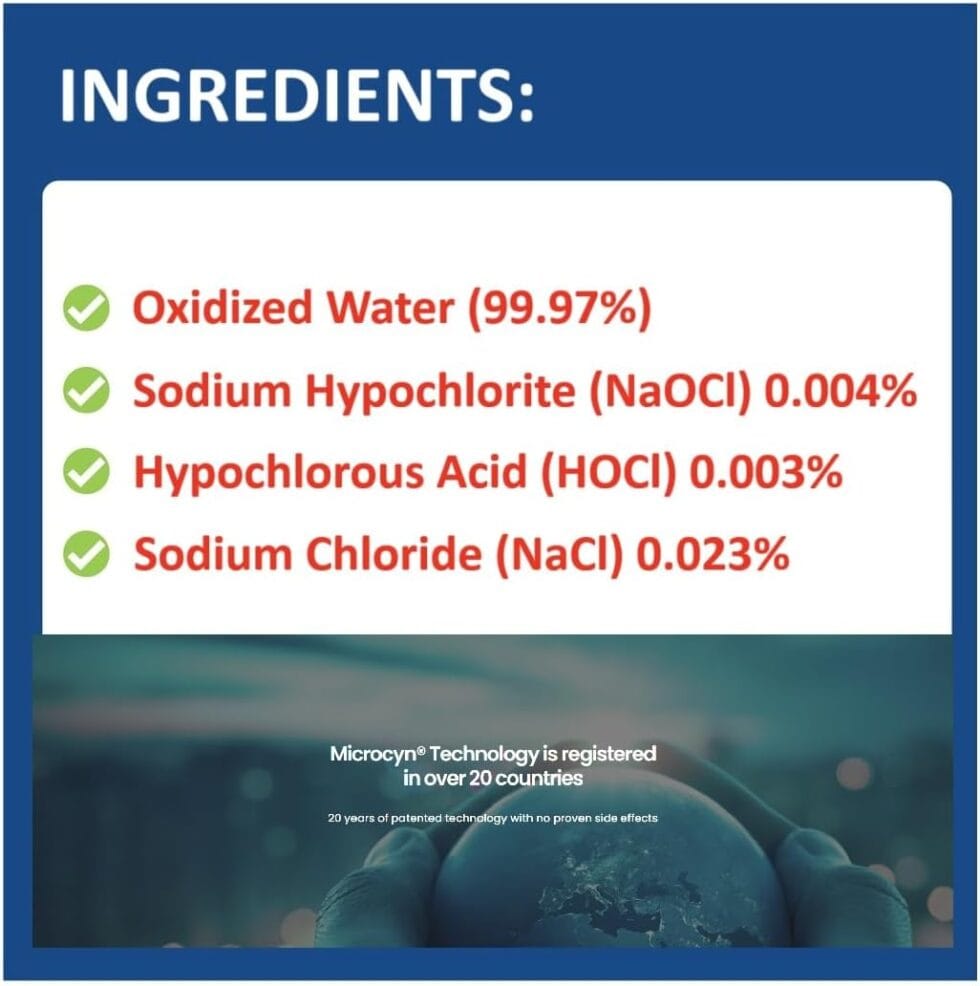 INGREDIENTS: Oxidized Water (99.97%), Sodium Chloride (NaCl) 0.023%, Sodium Hypochlorite (NaOCl) 0.004%, Hypochlorous Acid (HOCl) 0.003%