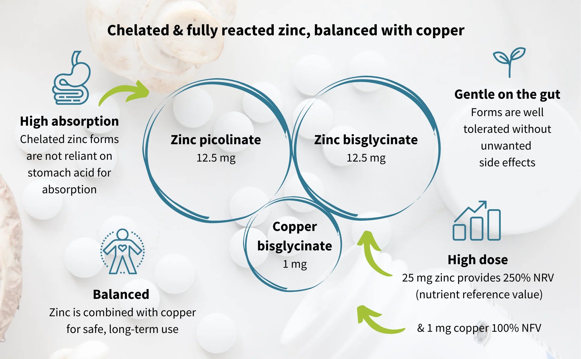 We use chelated forms in High Absorption Zinc Complex which are not reliant on optimal pH levels. By combining zinc picolinate with zinc bisglycinate, multiple uptake pathways are utilised, maximising absorption from supplement to cell. These gentle forms are well-tolerated without the unwanted side effects associated with standard zinc supplements (especially nausea). Balanced with copper for safe, long-term use, simply take one tablet daily with food.