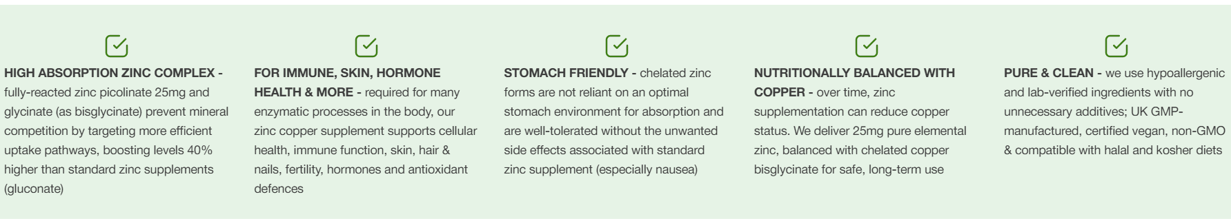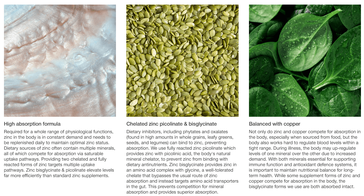 HIGH ABSORPTION ZINC COMPLEX – fully-reacted zinc picolinate 25mg and glycinate (as bisglycinate) prevent mineral competition by targeting more efficient uptake pathways, boosting levels 40% higher than standard zinc supplements (gluconate)