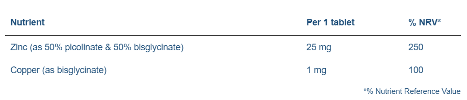 Ingredients: Bulking agents: microcrystalline cellulose, acacia gum; zinc picolinate; zinc bisglycinate; anti-caking agent: ascorbyl palmitate; copper bisglycinate; glazing agents: hydroxypropyl methylcellulose, glycerol.