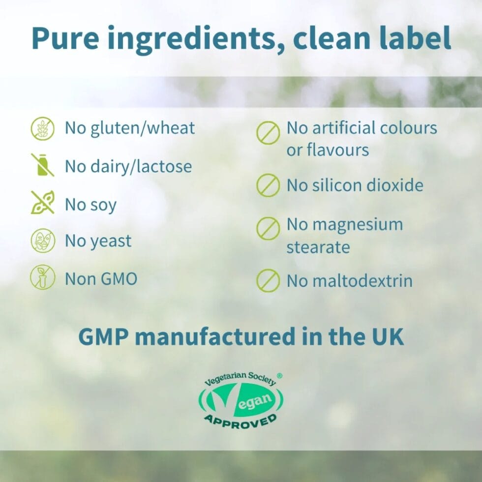 PURE & CLEAN – we use hypoallergenic and lab-verified ingredients with no unnecessary additives; UK GMP-manufactured, certified vegan, non-GMO & compatible with halal and kosher diets