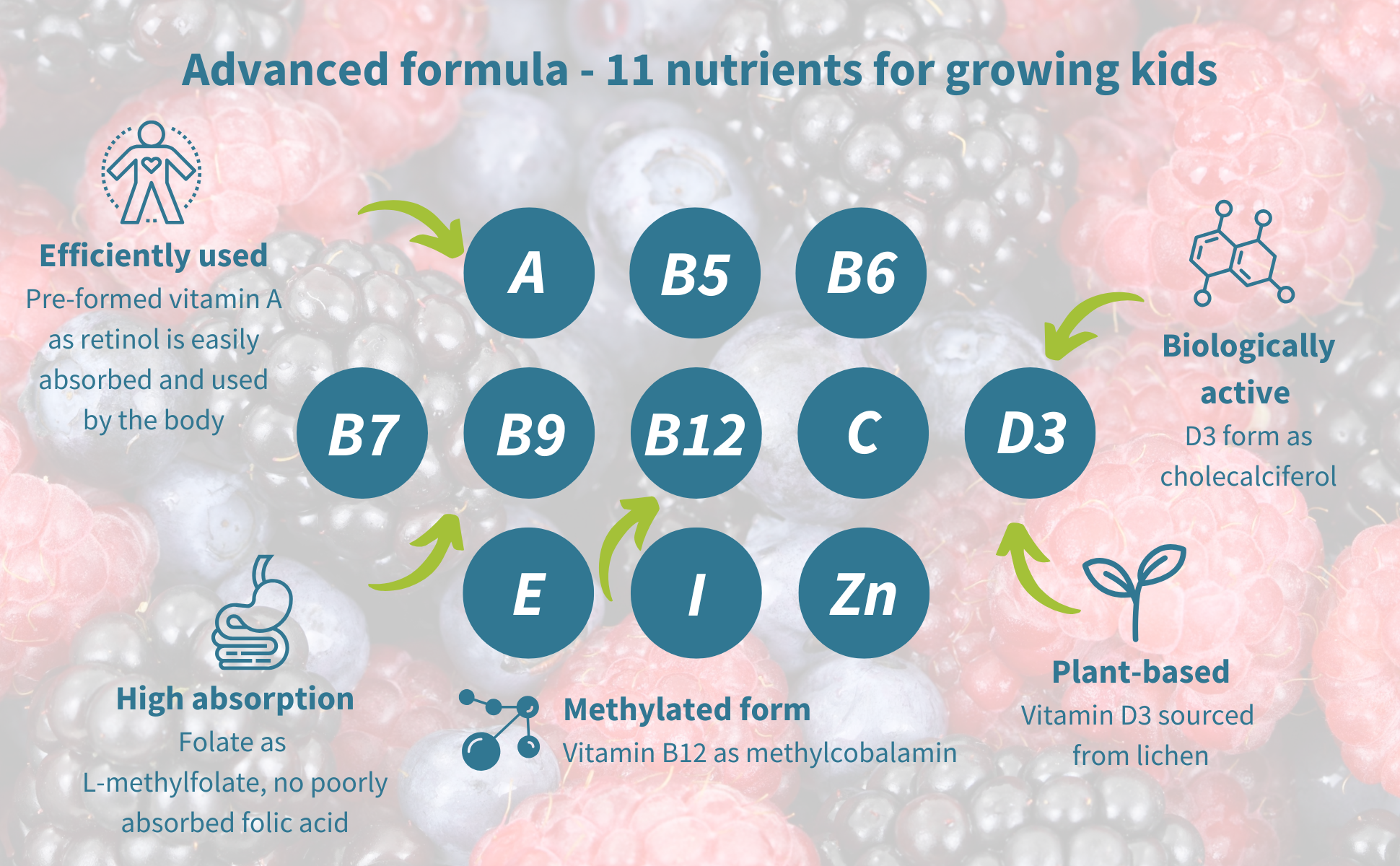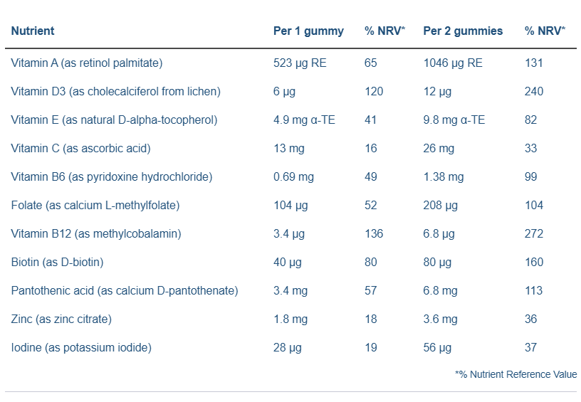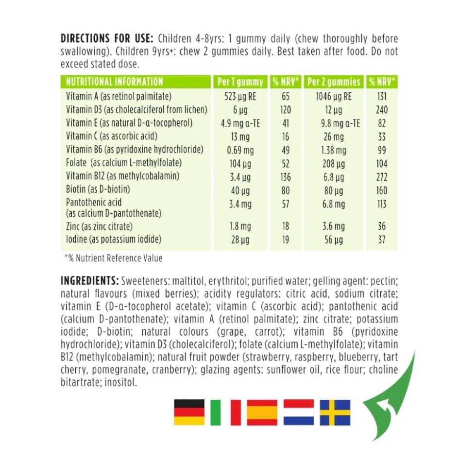 Ingredients: Sweeteners: maltitol, erythritol; purified water; gelling agent: pectin; natural flavours (mixed berries); acidity regulators: citric acid, sodium citrate; vitamin E (D-α-tocopherol acetate); vitamin C (ascorbic acid); pantothenic acid (calcium D-pantothenate); vitamin A (retinol palmitate); zinc citrate; potassium iodide; D-biotin; natural colours (grape, carrot); vitamin B6 (pyridoxine hydrochloride); vitamin D3 (cholecalciferol); folate (calcium L-methylfolate); vitamin B12 (methylcobalamin); natural fruit powder (strawberry, raspberry, blueberry, tart cherry, pomegranate, cranberry); glazing agents: sunflower oil, rice flour; choline bitartrate; inositol.