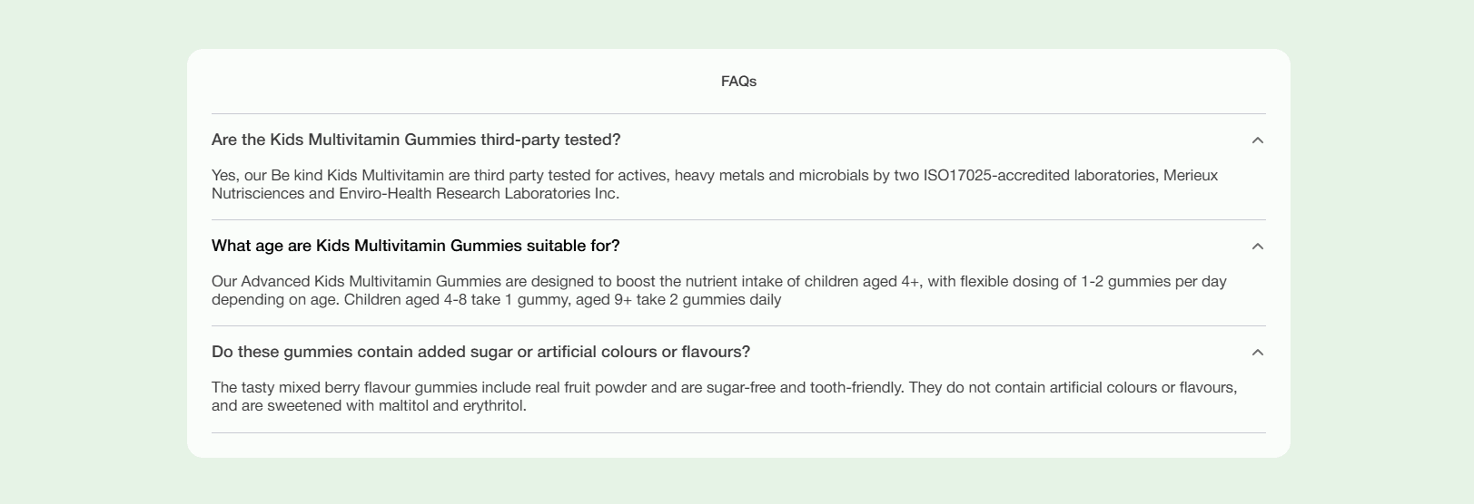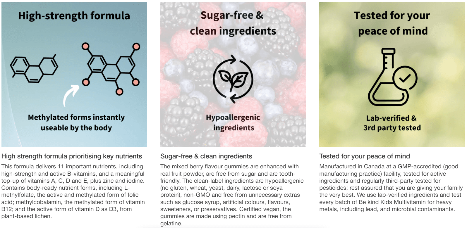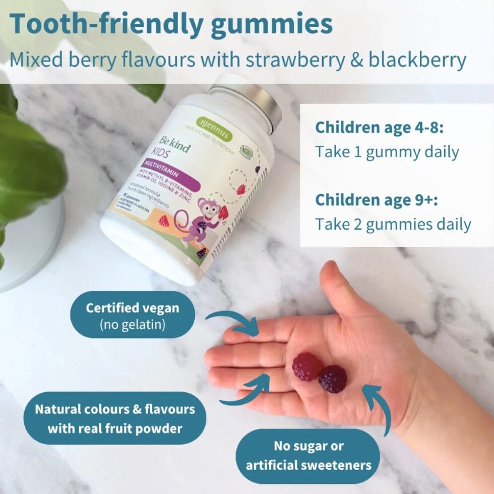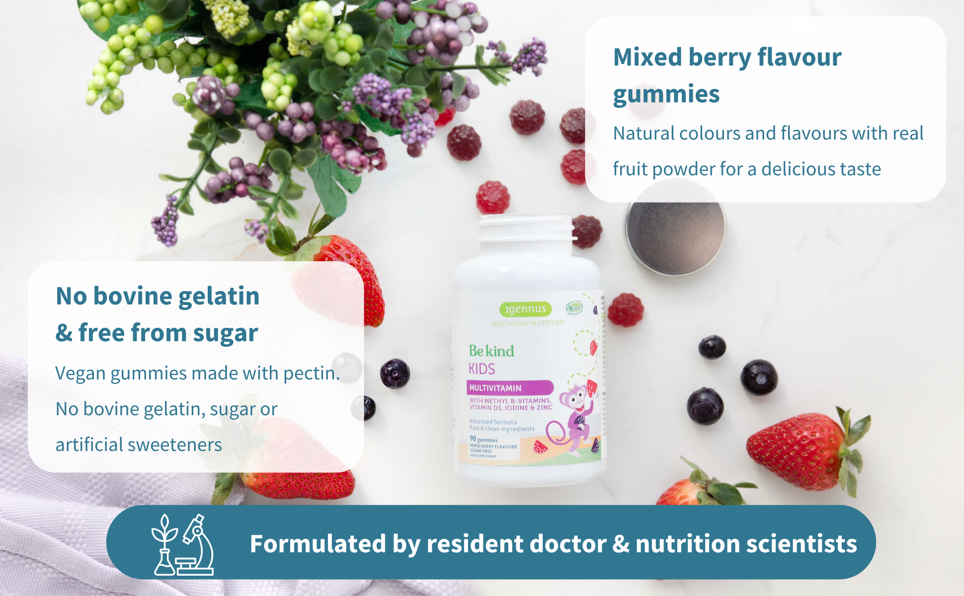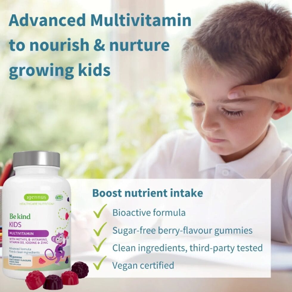 Be kind Kids Multivitamin is a high potency, bioavailable supplement designed to boost the nutrient intake of children aged 4+, with only clean ingredients and at doses higher than conventional gummies. Kids Multivitamin delivers 11 important nutrients in a tasty sugar-free gummy, to nourish and nurture growing children. Each gummy delivers a meaningful top-up of vitamins and minerals, including active B-vitamins for brain development and learning; iodine and zinc for growing bodies and bones; and vitamins A, C & D for immune support.
