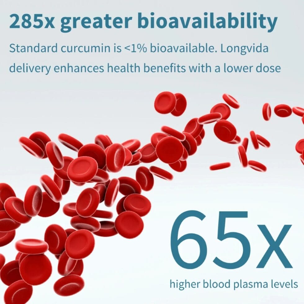 285x GREATER BIOAVAILABILITY – as standard curcumin is very poorly absorbed, Longvida provides a fatty coating around the curcumin, to enhance absorption