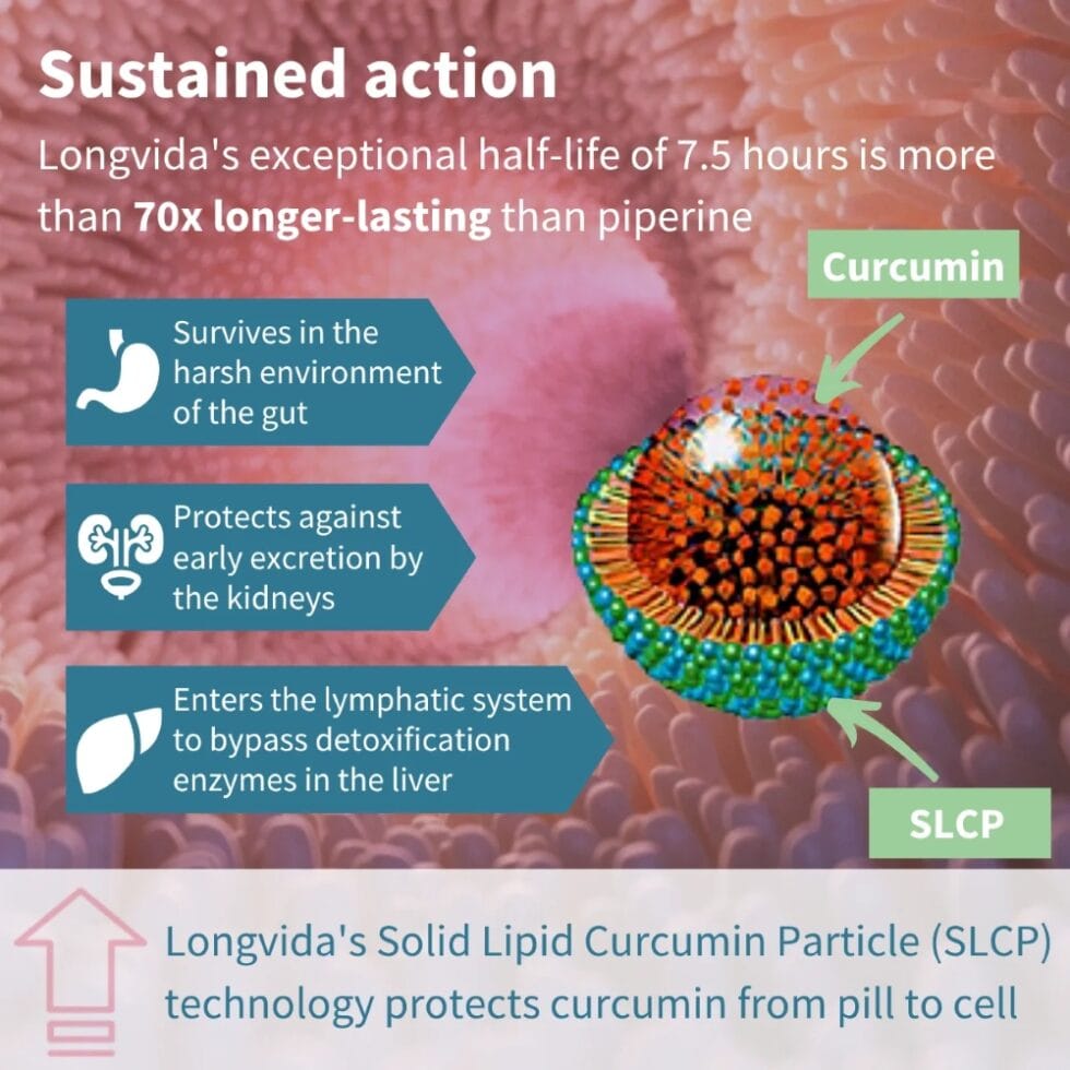Solid lipid curcumin particle (SLCP), as used in Longvida, offers 285x greater bioavailability, 65x higher peak plasma levels, and 7x longer-lasting action than standard curcumin