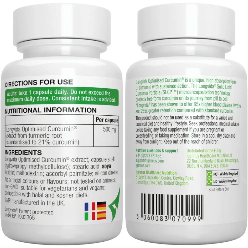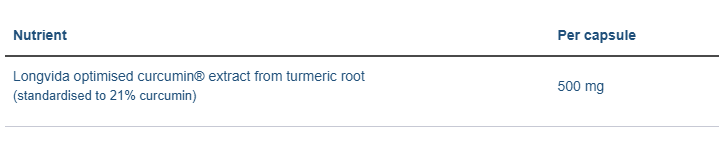 Ingredients: Longvida® Optimised Curcumin extract; capsule shell (hydroxypropyl methylcellulose); stearic acid; soya lecithin; maltodextrin; ascorbyl palmitate; silicon dioxide.