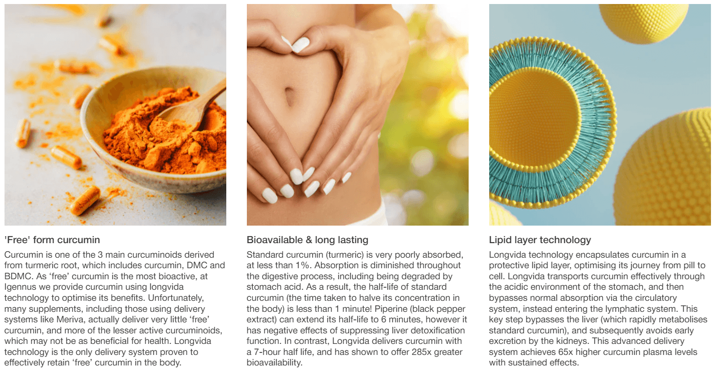 HIGH DOSE IN FREE FORM – Longvida provides free form curcumin which is directly transported into the lymphatic system, ensuring clinically beneficial levels in the body
