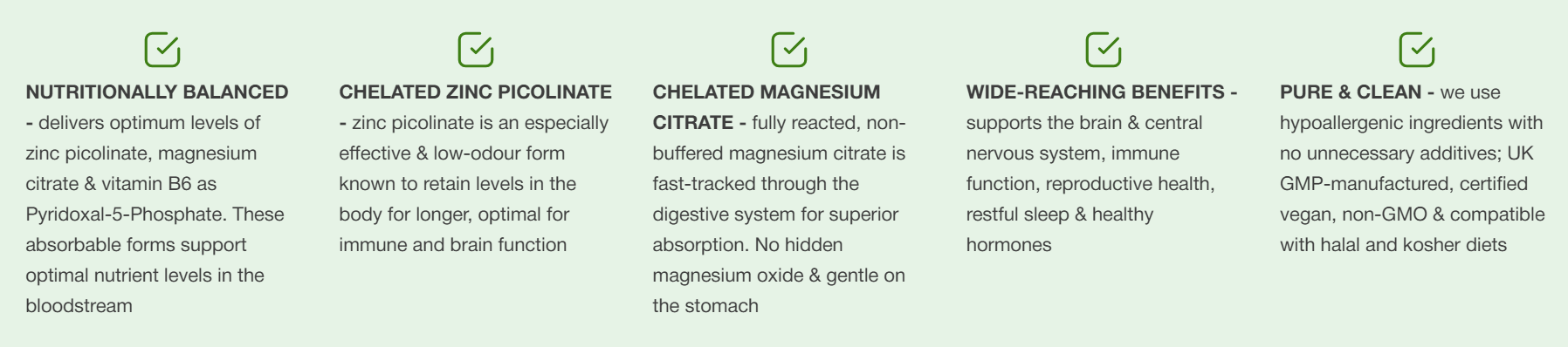 NUTRITIONALLY BALANCED – delivers optimum levels of zinc picolinate, magnesium citrate & vitamin B6 as Pyridoxal-5-Phosphate. These absorbable forms support optimal nutrient levels in the bloodstream