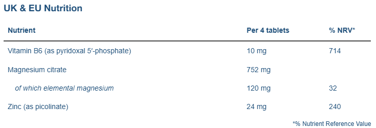 UK EU &Ingredients: Magnesium citrate; bulking agents: microcrystalline cellulose, acacia gum, hydroxypropyl cellulose; zinc picolinate; anti-caking agent: ascorbyl palmitate; vitamin B6 (pyridoxal 5′-phosphate); glazing agents: hypromellose, glycerol.