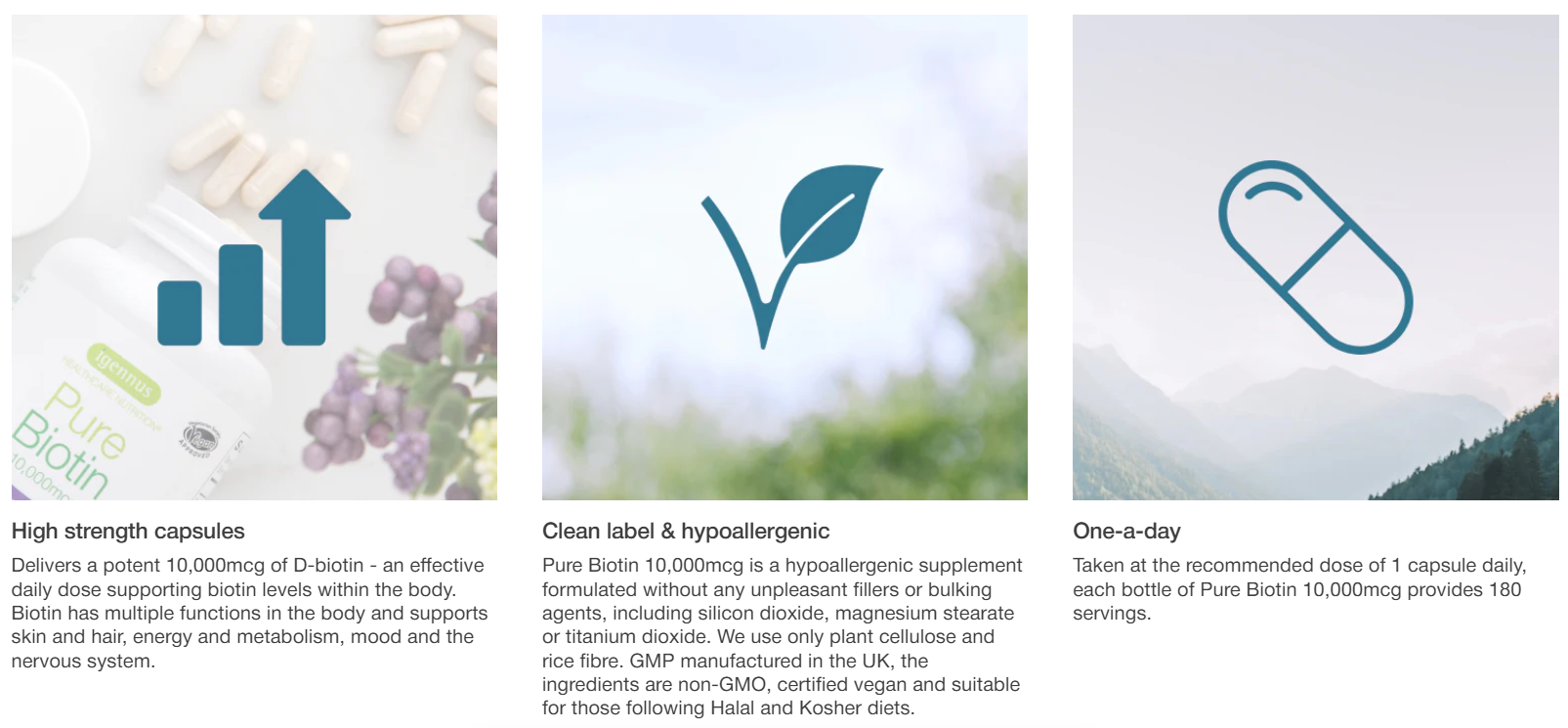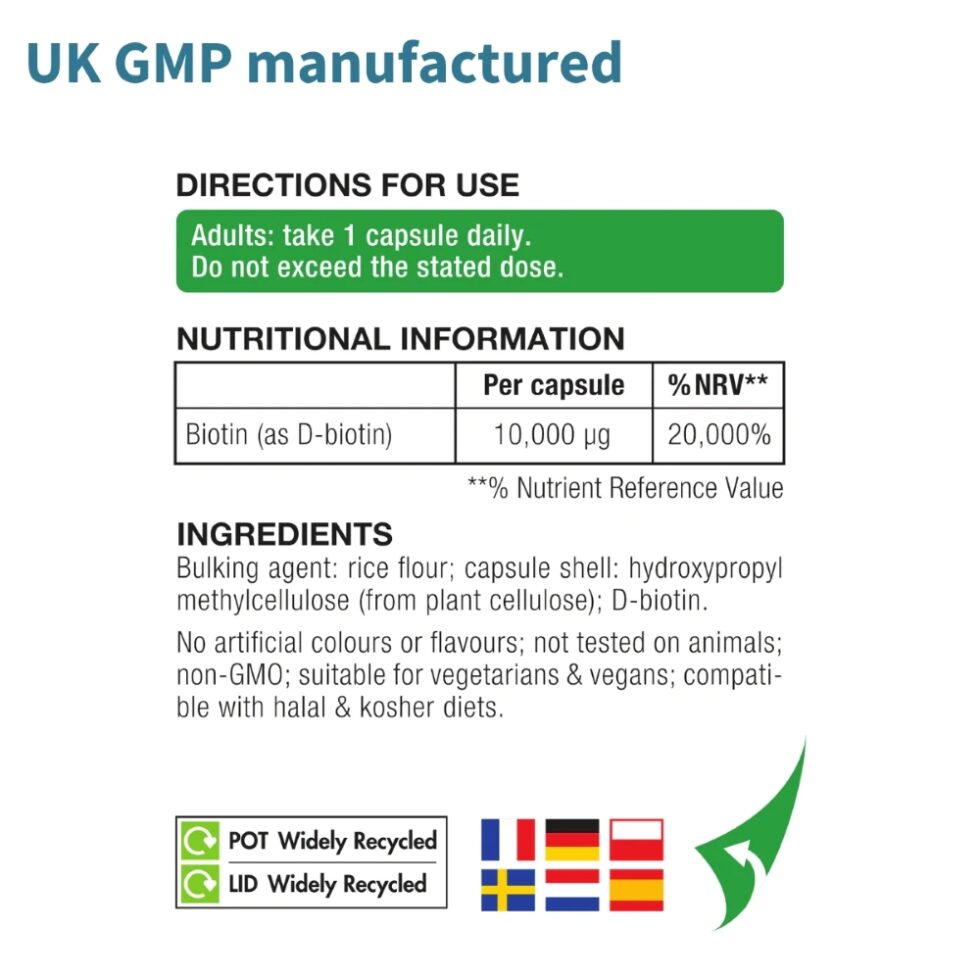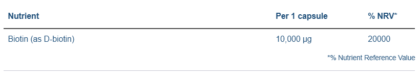 This product should not be used as a substitute for a varied and balanced diet and healthy lifestyle. Seek professional medical advice before taking any food supplement if you are pregnant or breastfeeding, or taking medication. High-dose biotin may interfere with certain blood test results; ask your doctor whether you need to stop biotin before your test. Keep out of the reach of children. Store in a cool, dry place and away from sunlight.