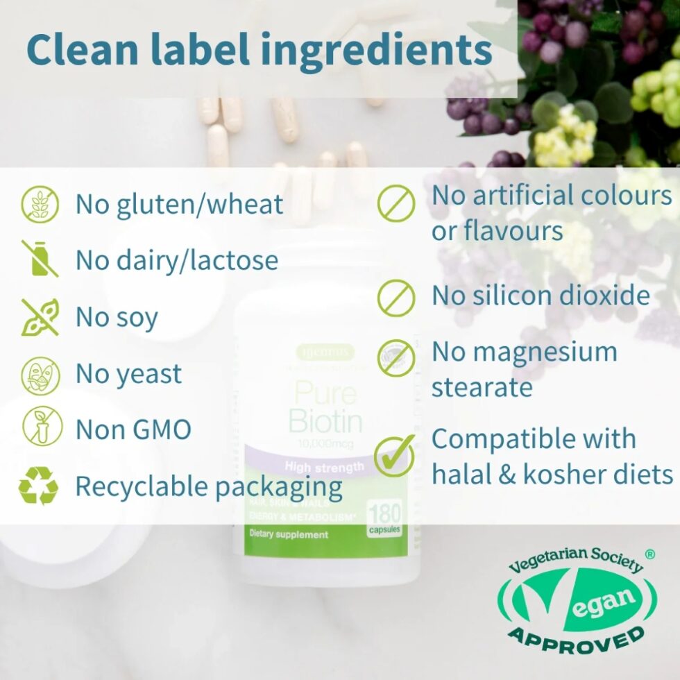 PURE & CLEAN – we use hypoallergenic and lab-verified ingredients with no unnecessary additives; UK GMP-manufactured, certified vegan, non-GMO & compatible with halal and kosher diets