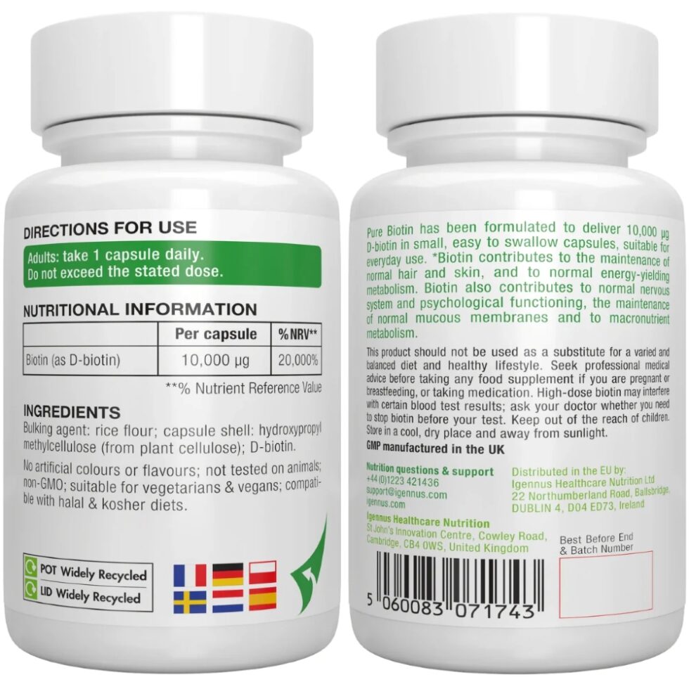 Pure Biotin has been formulated to deliver a high-strength dose of 10,000μg D-biotin (vitamin B7) in 180 capsules, suitable for everyday use. Biotin is best known for supporting skin health and the production of keratin – a protein that promotes strong hair and nails. Biotin is also required for multiple essential physiological functions in the body including nutrient and energy metabolism, the nervous system and psychological function.