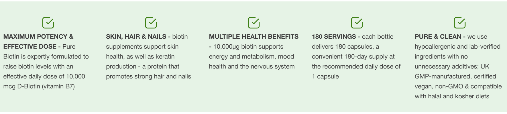 MAXIMUM POTENCY & EFFECTIVE DOSE – Pure Biotin is expertly formulated to raise biotin levels with an effective daily dose of 10,000 mcg D-Biotin (vitamin B7)