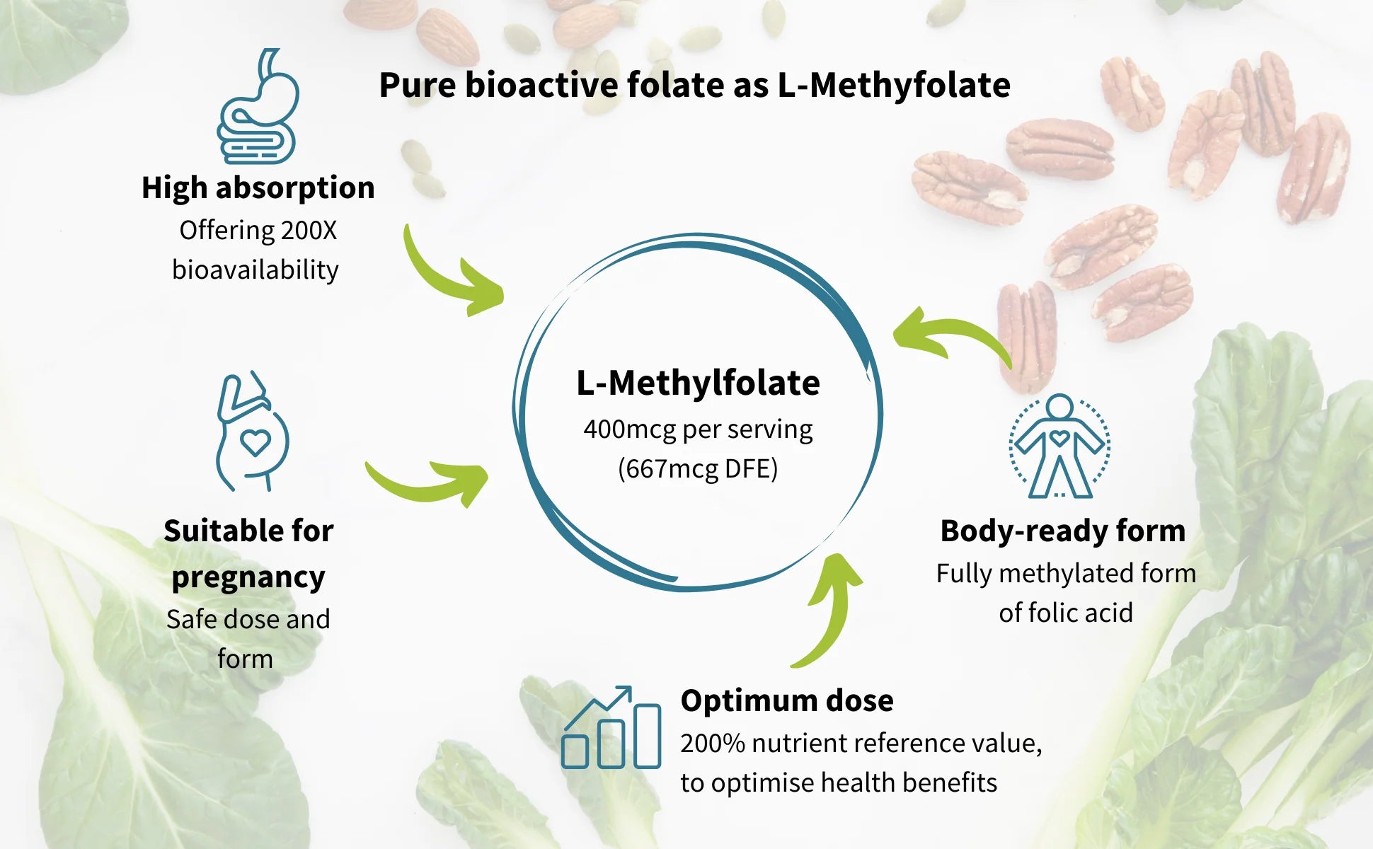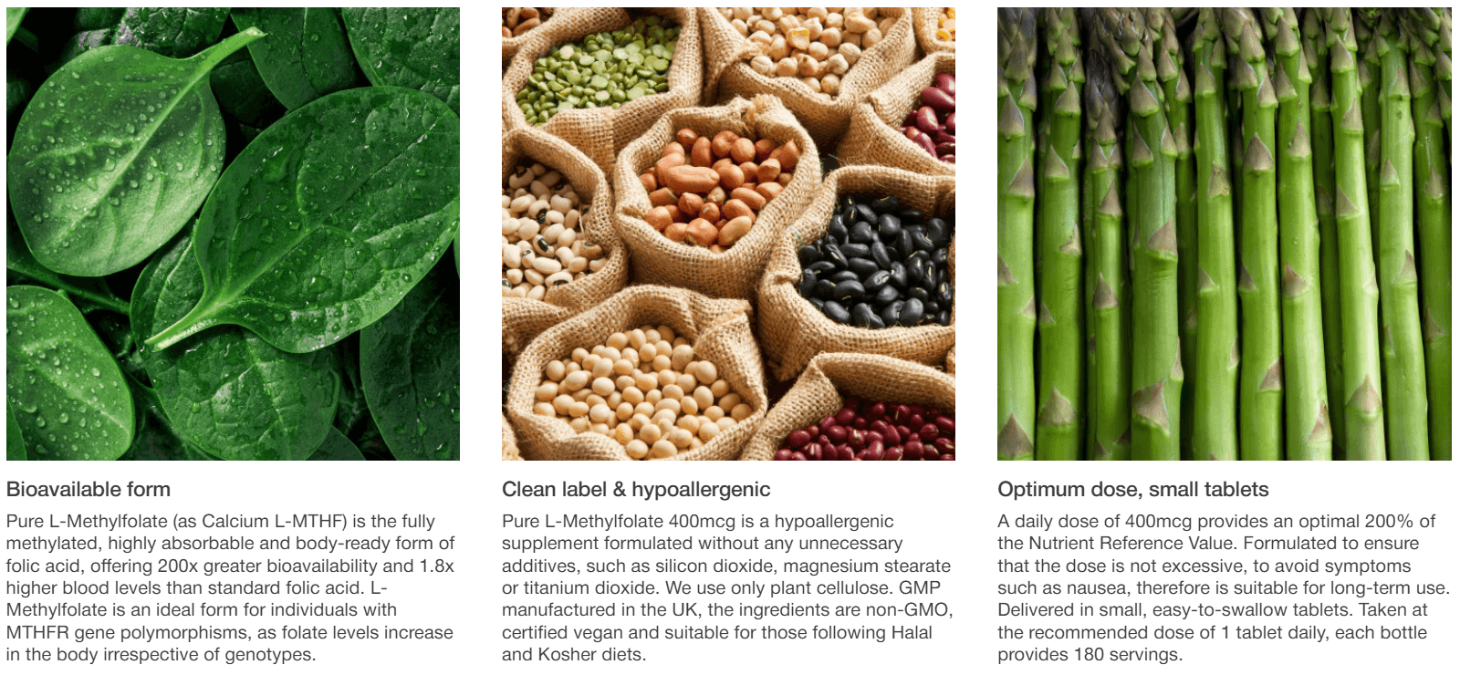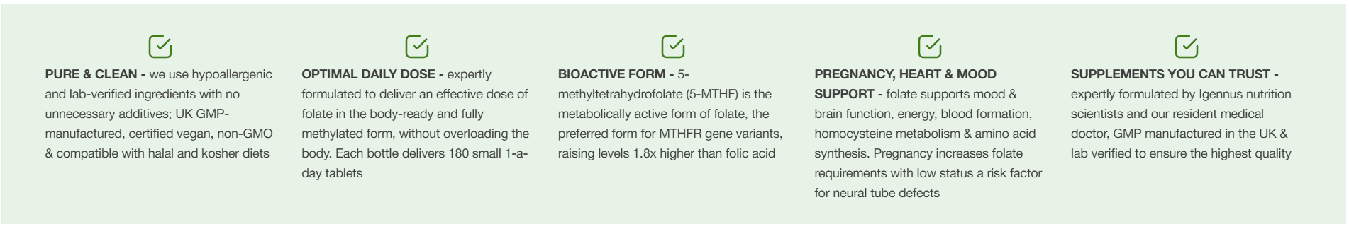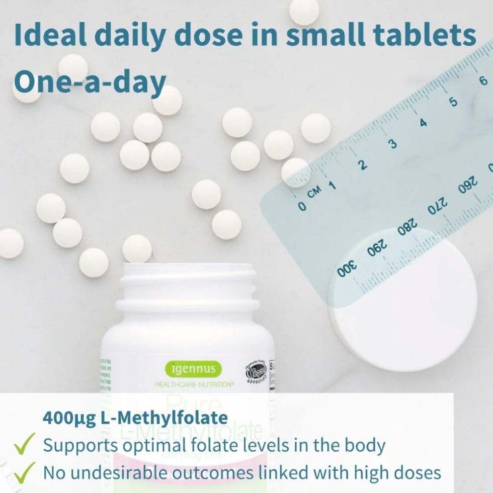 Pure L-Methylfolate 400µg is a clean-label, hypoallergenic folate supplement formulated by Igennus nutrition scientists to work in harmony with the body. Pure L-Methylfolate delivers an optimal daily dose of 400µg folate in the body-ready and fully methylated form, ideal for providing health benefits without upsetting homeostasis. Each bottle delivers 180 small, easy-to-swallow tablets.