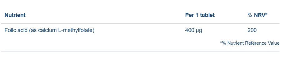 Ingredients: Bulking agents: dicalcium phosphate, microcrystalline cellulose; anti-caking agent: ascorbyl palmitate; glazing agent: hydroxypropyl methylcellulose; folic acid (as calcium L-methylfolate).