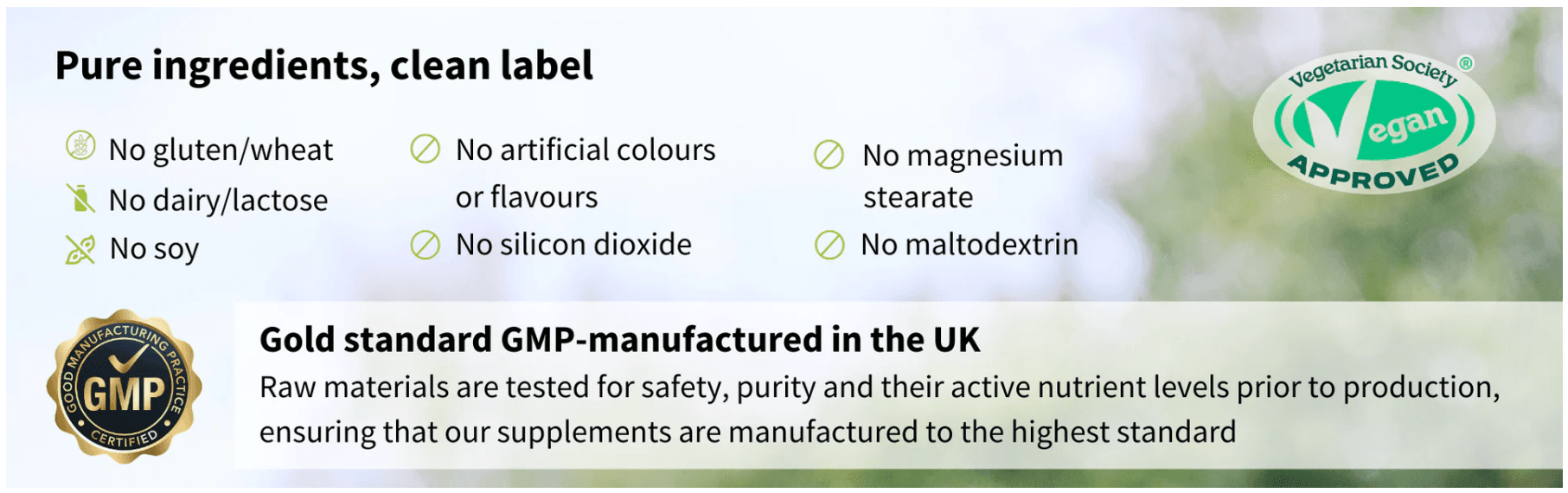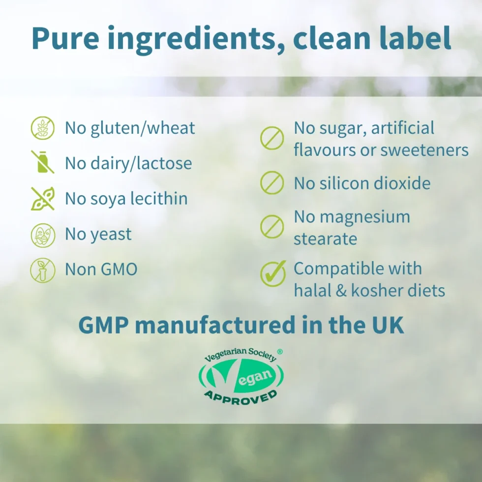 No sugar, artificial colours, flavours or sweeteners; not tested on animals; non-GMO; suitable for vegetarians & vegans; compatible with halal & kosher diets.