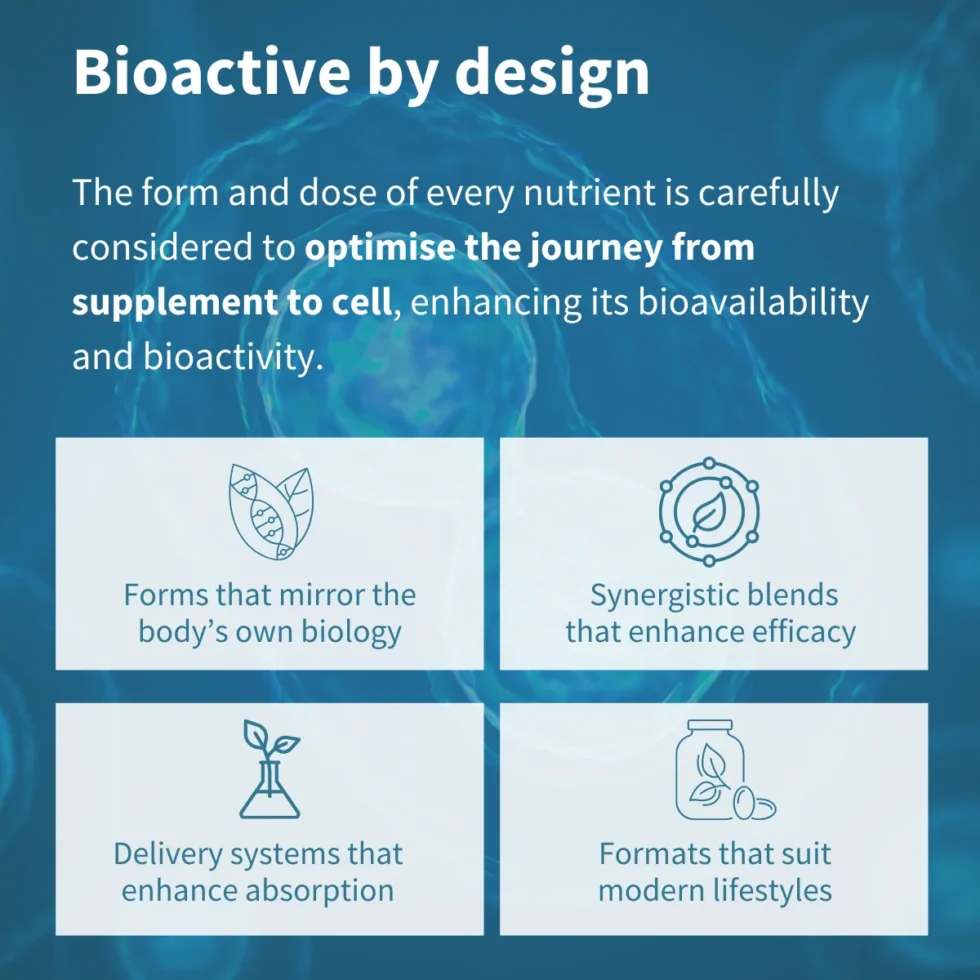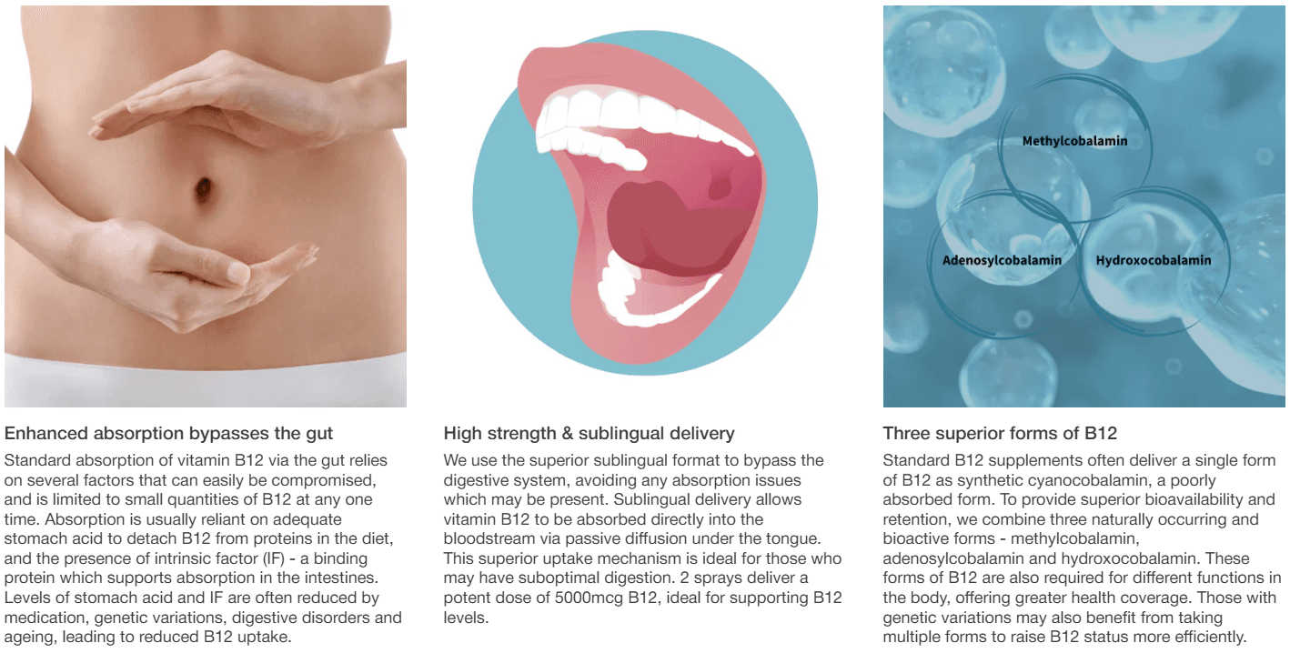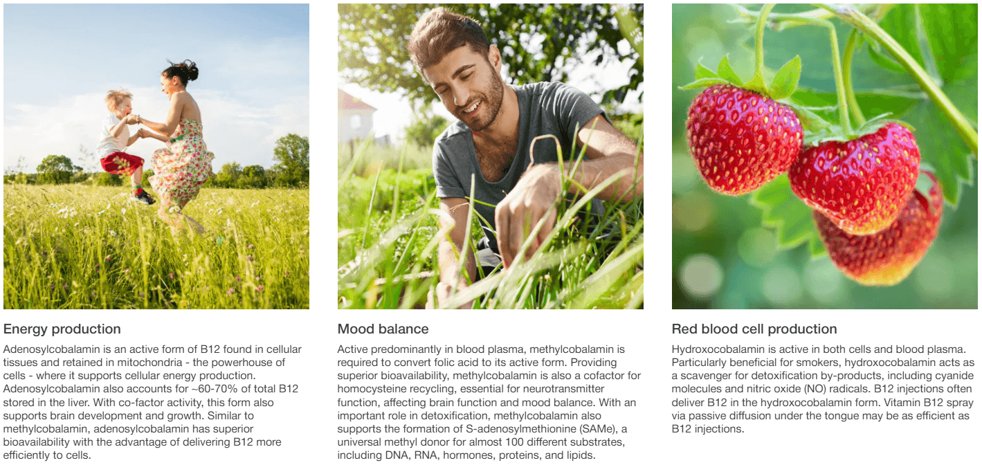 Different forms of B12 are required for different functions in the body, so we provide three naturally occurring and bioactive forms – methylated methylcobalamin, plus adenosylcobalamin and hydroxocobalamin – for greater health coverage.