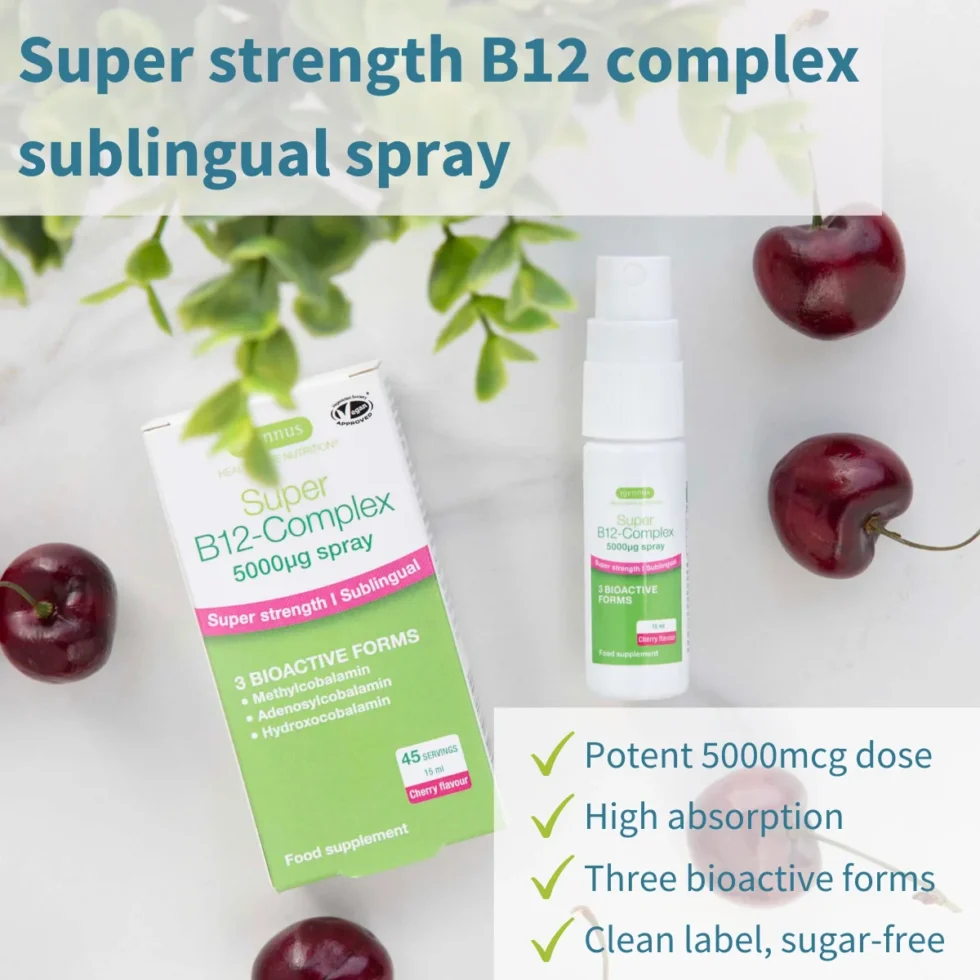 Super B12-Complex 5000mcg Spray has been expertly formulated to effectively raise cellular levels of this essential nutrient. The superior sublingual format delivers vitamin B12 directly into the bloodstream, bypassing gut absorption challenges. With a natural cherry flavour, Super B12-Complex is pleasant and easy to use.