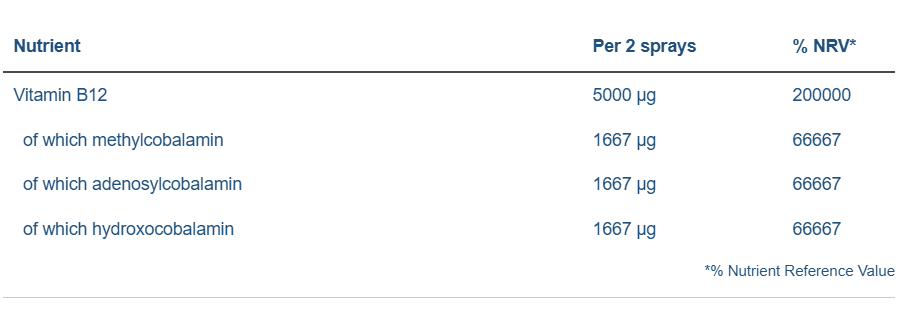 Ingredients: Water; sweetener: xylitol; vitamin B12 (as methylcobalamin, adenosylcobalamin & hydroxocobalamin); natural flavouring (cherry); acidity regulator: citric acid; preservative: potassium sorbate