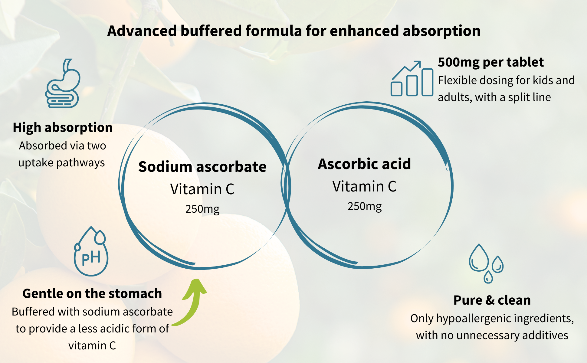 Vitamin C 500mg Chewable has been expertly formulated to provide a gentle and buffered blend of sodium ascorbate and ascorbic acid. Combining these two vitamin C forms enhances bioavailability, as absorption can take place via two uptake pathways. Delivered in mixed orange and lemon flavour sugar-free chewable tablets, ideal for adults and kids aged 4+.